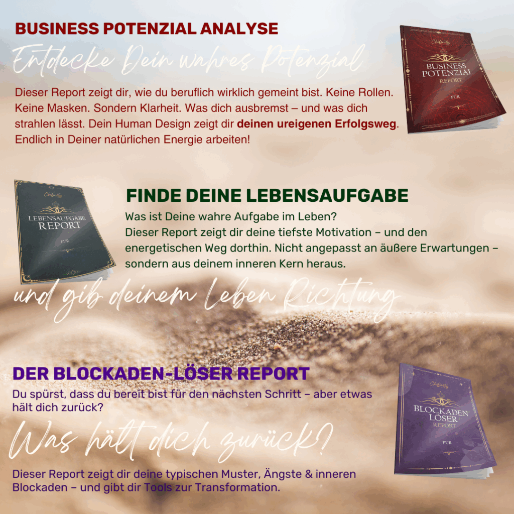 Potenzialentdeckung mit Human Design: Wenn Du Dich weiterentwickeln möchtest, Dein einzigartiges Potenzial entdecken, Blockaden lösen möchtest, dann werden Dich die individuellen Chifinity Human Design Analysen zu spannenden und hilfreichen Erkenntnissen führen! Informationen und Bestellmöglichkeiten der umfangreichen Reports findest Du hier im Bereich Human Design.